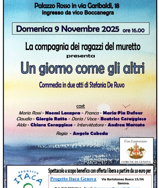 Secondo incontro stagionale con il Teatro, in questa occasione con la Compagnia dei Ragazzi del Muretto, che propongono la commedia “Un Giorno come gli Altri”, scritta da Stefania De Ruvo, sempre per la regia di Angelo Cubeda. La rappresentazione avverrà nella prestigiosa e storica sede del Teatro Centrale Stradanuova, nel cuore della città. Al termine, verrà offerto un piccolo rinfresco nel foyer. Non mancate!