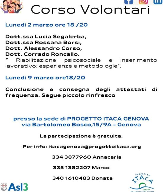 Presso la Casa delle Federazioni e dello Sport, in Viale Padre Santo, n. 1 (zona Corvetto, tranne che per le date del 9/2 e 2/3, quando gli incontri si svolgeranno presso la sede dell’associazione) continua il nuovo corso volontari di Progetto Itaca Genova, in collaborazione con il Dipartimento di Salute Mentale e Dipendenze Patologiche della ASL 3 genovese, diretto dal Dr. Rocco Luigi Picci.
