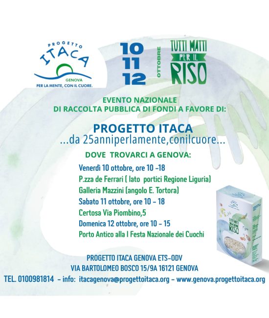 Puoi trovarci venerdì 10 ottobre in Galleria Mazzini e in Piazza De Ferrari, dalle 10:00 alle 18:00. Accanto alla fontana della città parteciperemo inoltre, con le altre associazioni cittadine e il Dipartimento di Salute Mentale e Dipendenze, alla celebrazione della Giornata Mondiale per la Salute Mentale. Sabato 11 ottobre saremo a Genova- Certosa, in via Piombino, sempre dalle 10:00 alle 18:00. Presso le nostre postazioni potrai aiutarci a sostenere i nostri progetti ricevendo uno o più pacchi di riso di qualità, dietro la corresponsione di un’offerta in denaro minima di dieci euro al chilo. Ti ringraziamo sentitamente per l’aiuto che ci vorrai dare.